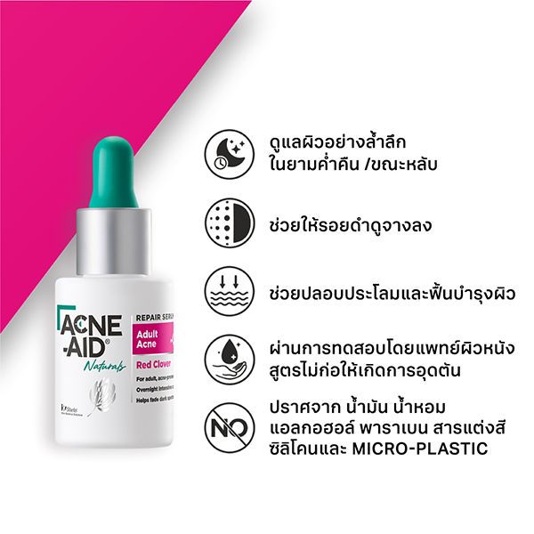 Acne-Aid Naturals Repair Serum เซรั่มบำรุงผิวสำหรับผู้ใหญ่ที่เป็นสิวง่าย ให้การดูแลผิวที่เป็นสิวอย่างล้ำลึกและตรงจุด อุดมด้วยสารสกัดจาก Red Clover, Prebiulin AGA และNiacinamide ช่วยบำรุงและปลอบประโลมผิว ฟื้นฟูผิว และช่วยลดเลือนจุดด่างดำและปรับสีผิวให้สม่ำเสมอ เพื่อผิวที่ดูใสสุขภาพดี เนื้อเซรั่มซึมซาบไวไม่เหนียวเหนอะหนะ สูตรไม่อุดตันรูขุมขน ผ่านการทดสอบโดยแพทย์ผิวหนัง อ่อนโยนต่อผิวแพ้ง่าย และปราศจากน้ำมัน น้ำหอม แอลกอฮอล์ และสารระคายเคืองอื่น ๆ เหมาะสำหรับผู้ที่มีปัญหาสิวและต้องการเห็นผลลัพธ์ที่ชัดเจน